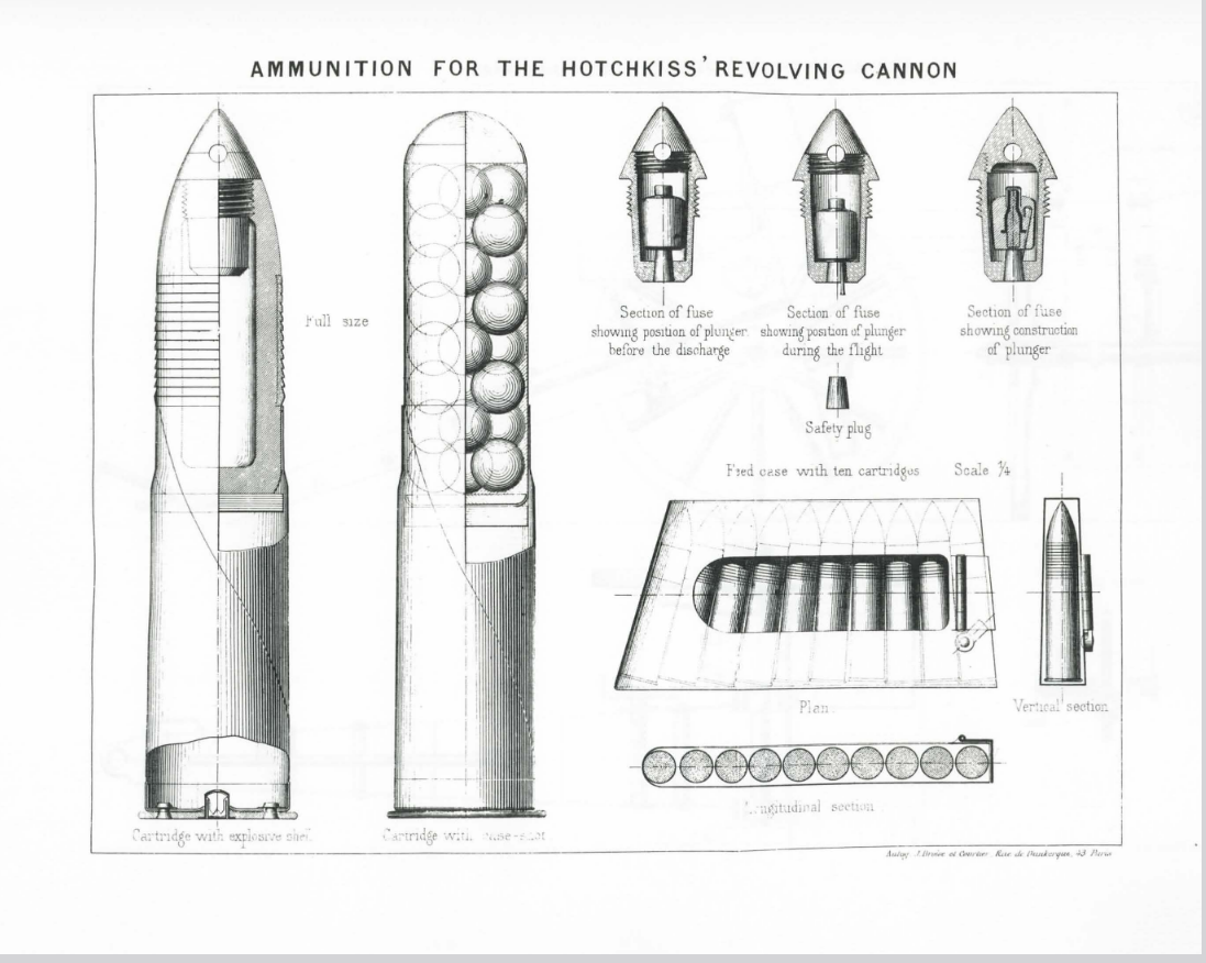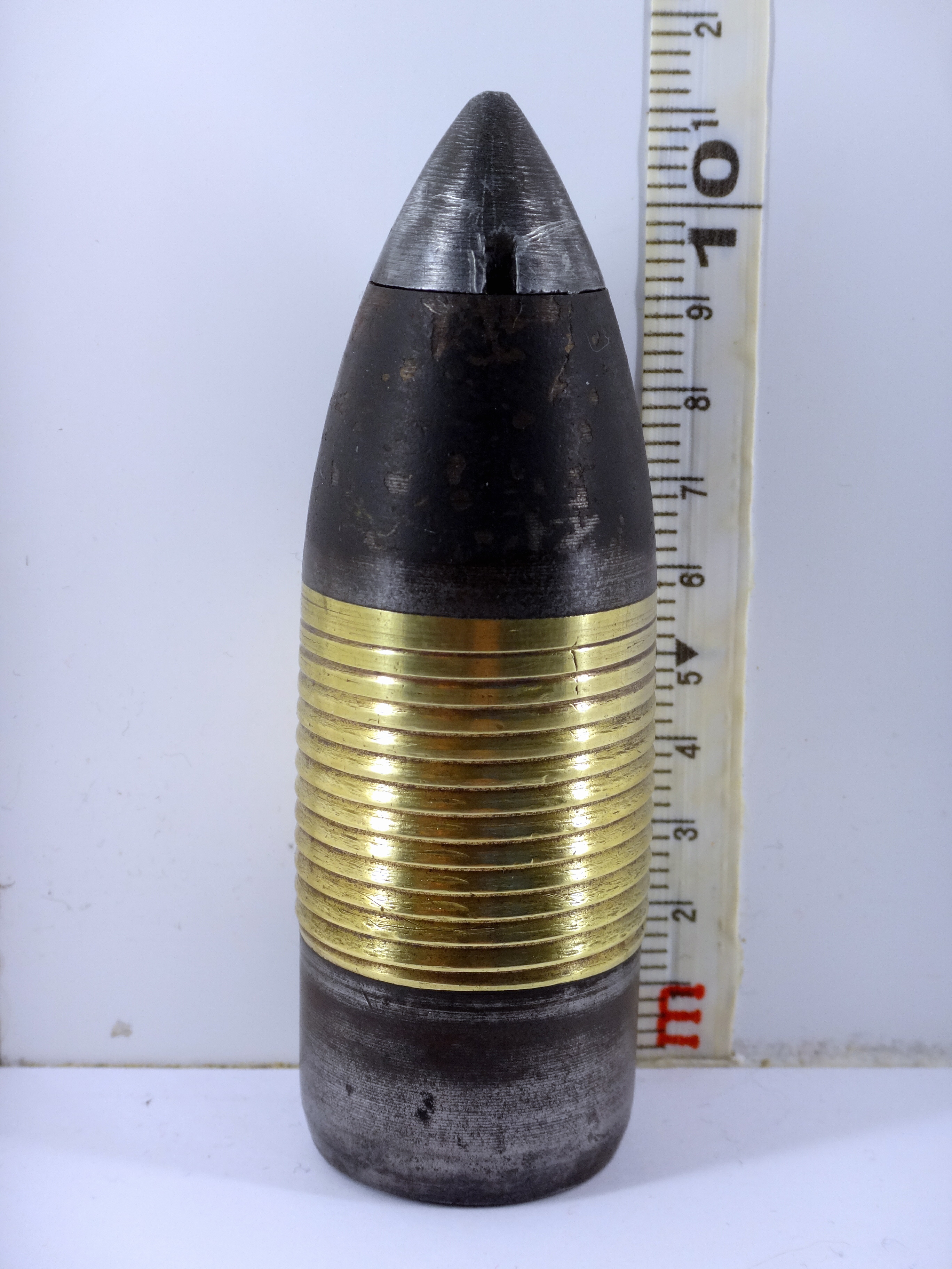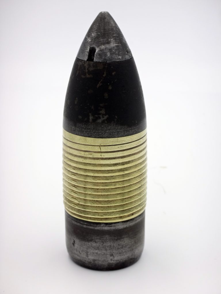 Obus explosif à fusée inerte utilisé lors des essais de 1874/1875 du canon-revolver présenté par Benjamin Hotchkiss à la commission d'expériences de Bourges (France). Explosive shell with an inert fuse used during the 1874/1875 trials of the revolver-cannon presented by Benjamin Hotchkiss to the Bourges (France) experimental commission.