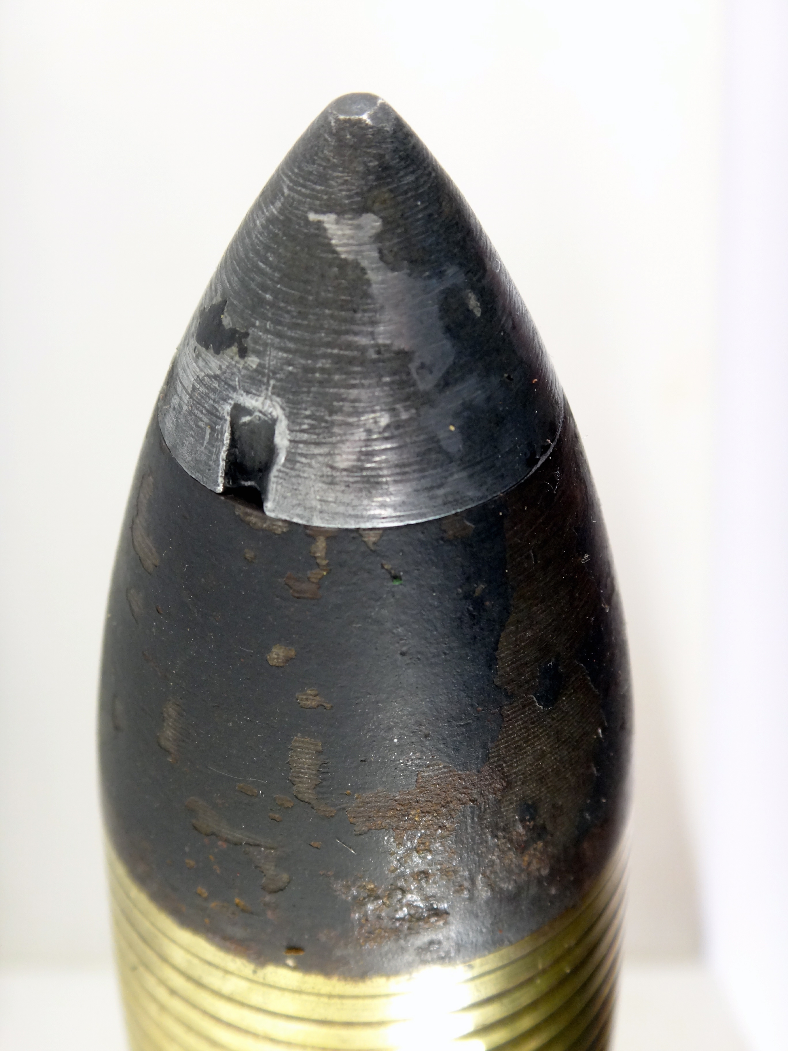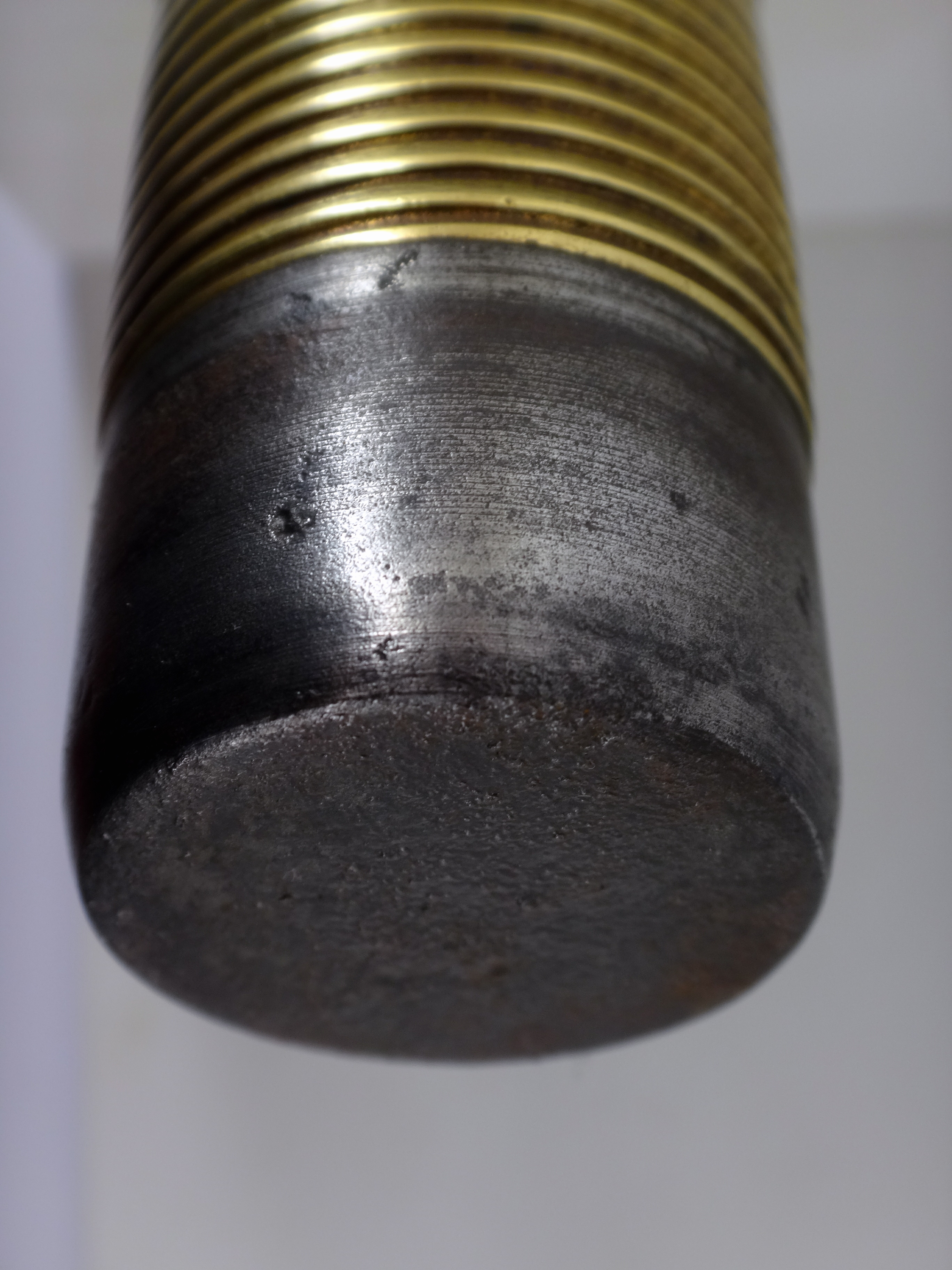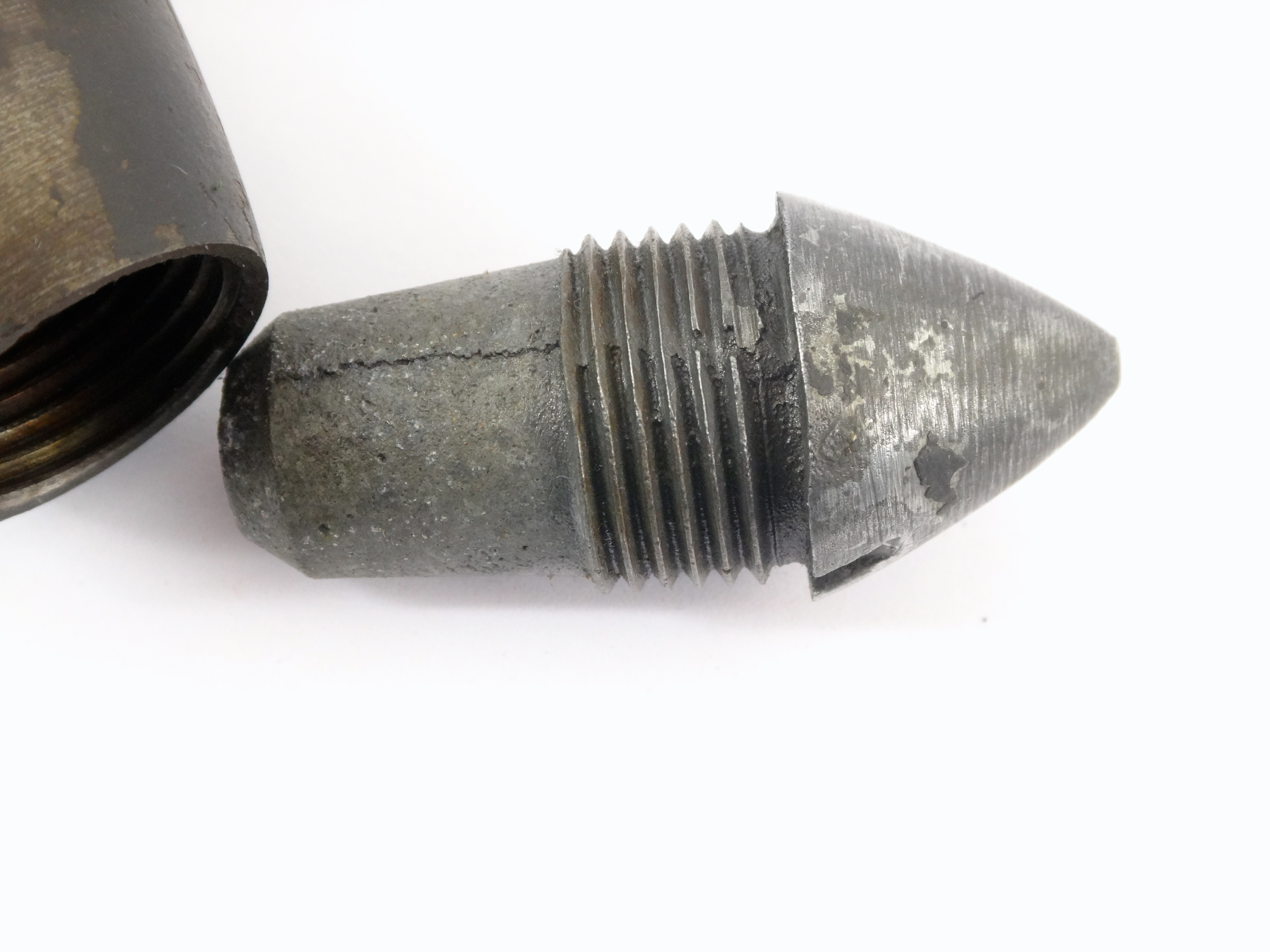 Obus explosif à fusée inerte utilisé lors des essais de 1874/1875 du canon-revolver présenté par Benjamin Hotchkiss à la commission d'expériences de Bourges (France). Explosive shell with an inert fuse used during the 1874/1875 trials of the revolver-cannon presented by Benjamin Hotchkiss to the Bourges (France) experimental commission.