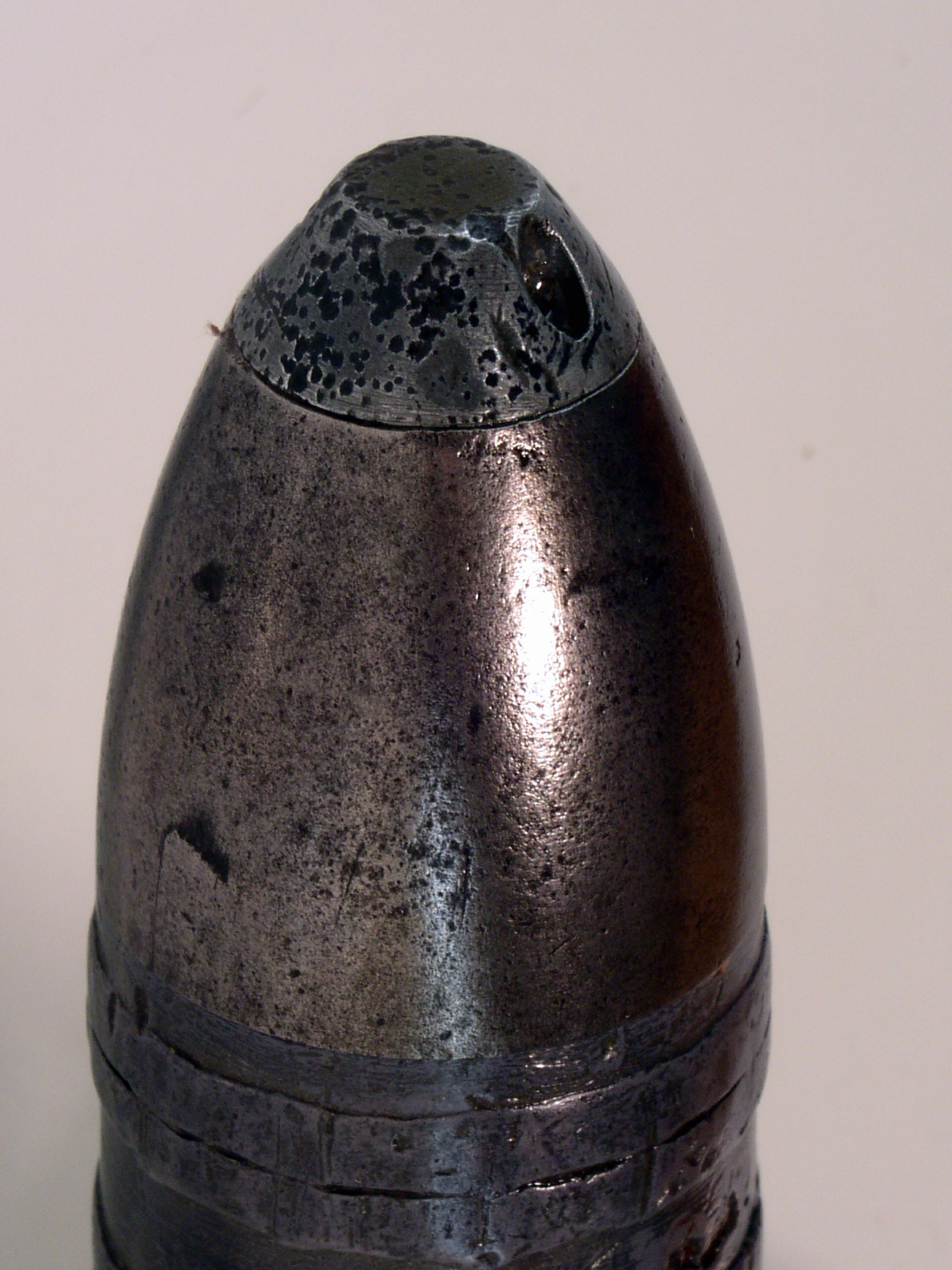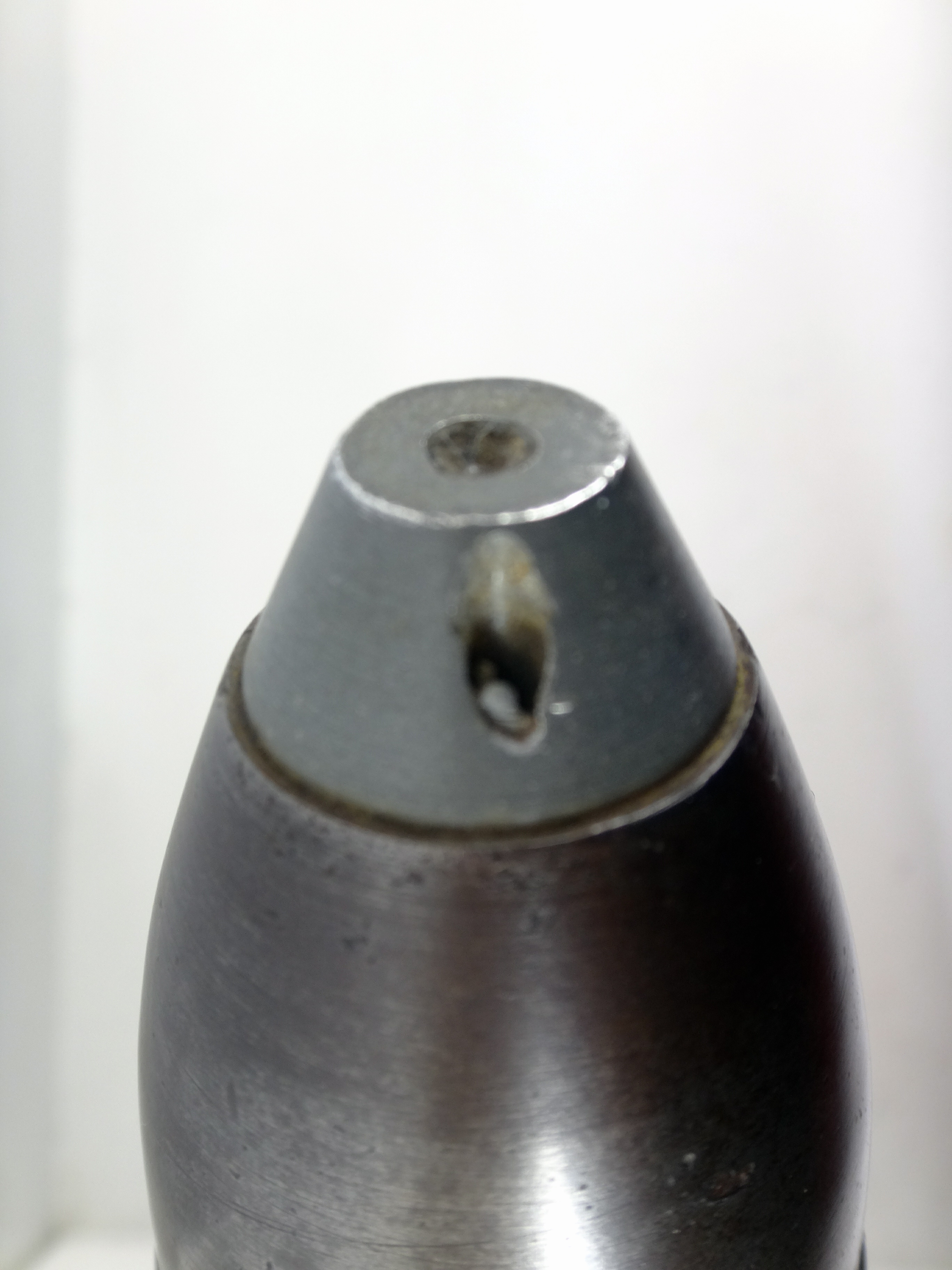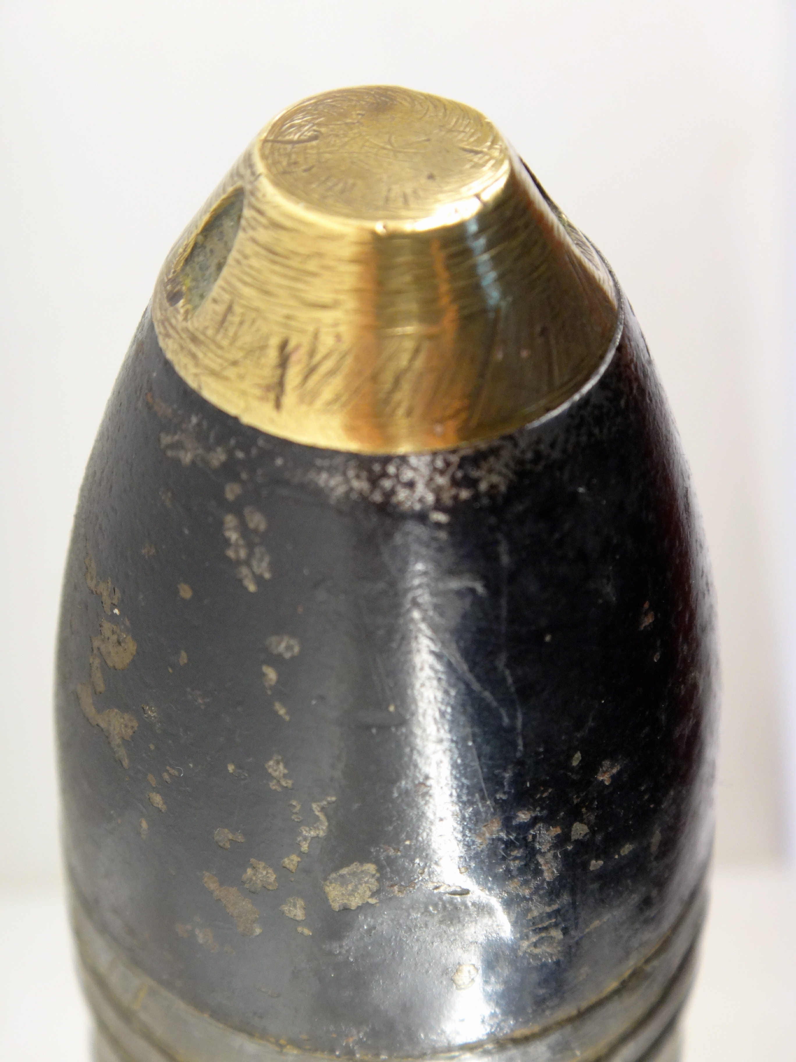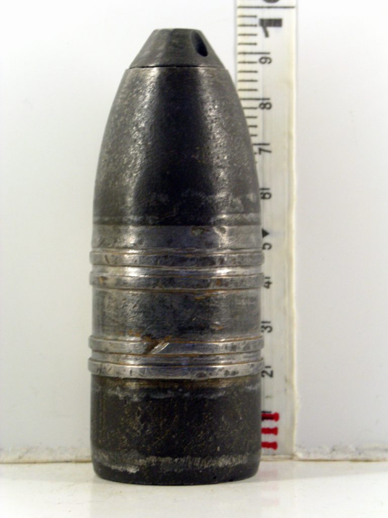 Obus explosif à large ceinture de plomb et fusée inerte / Explosive shell with a wide lead band and inert fuse