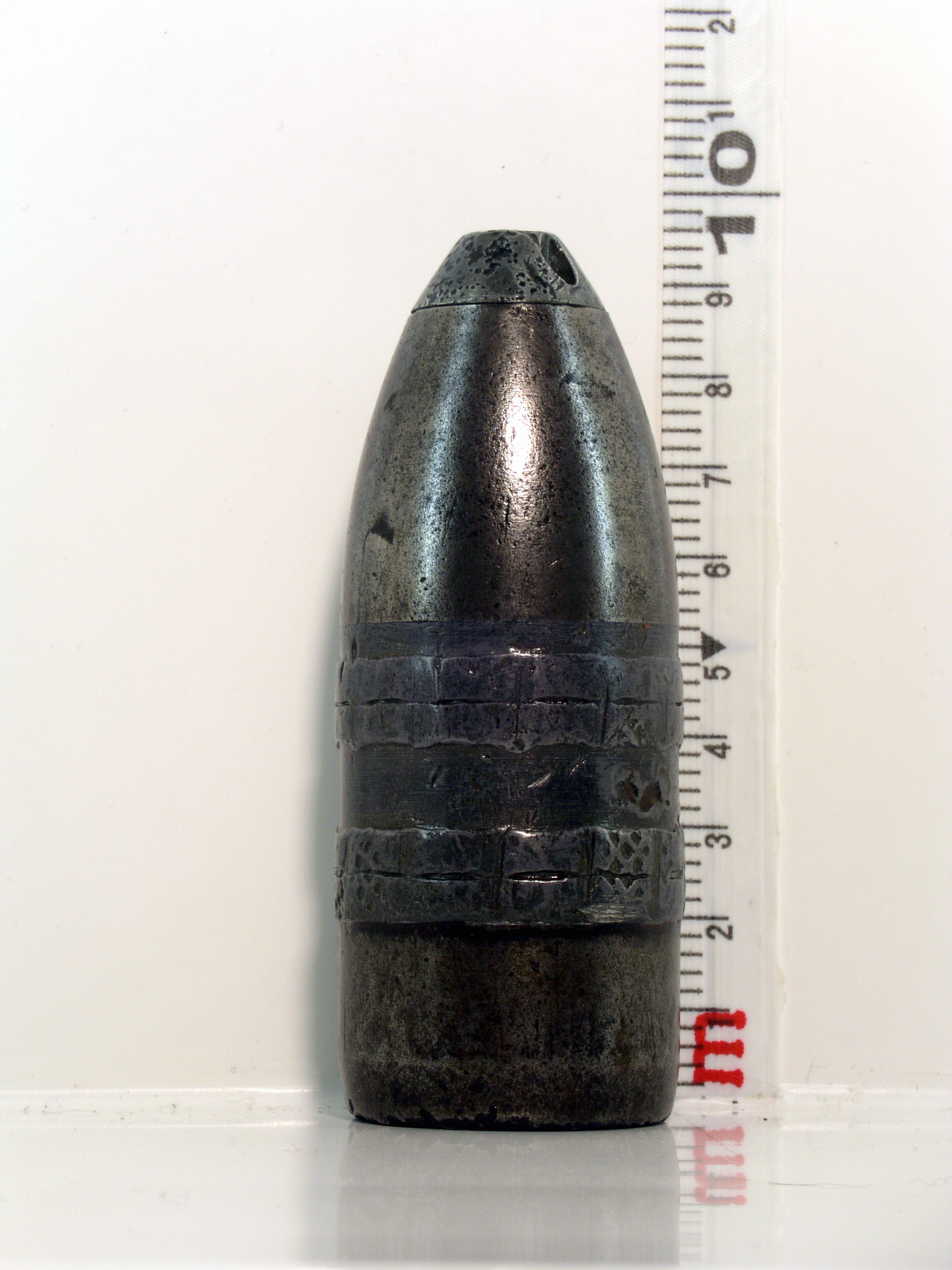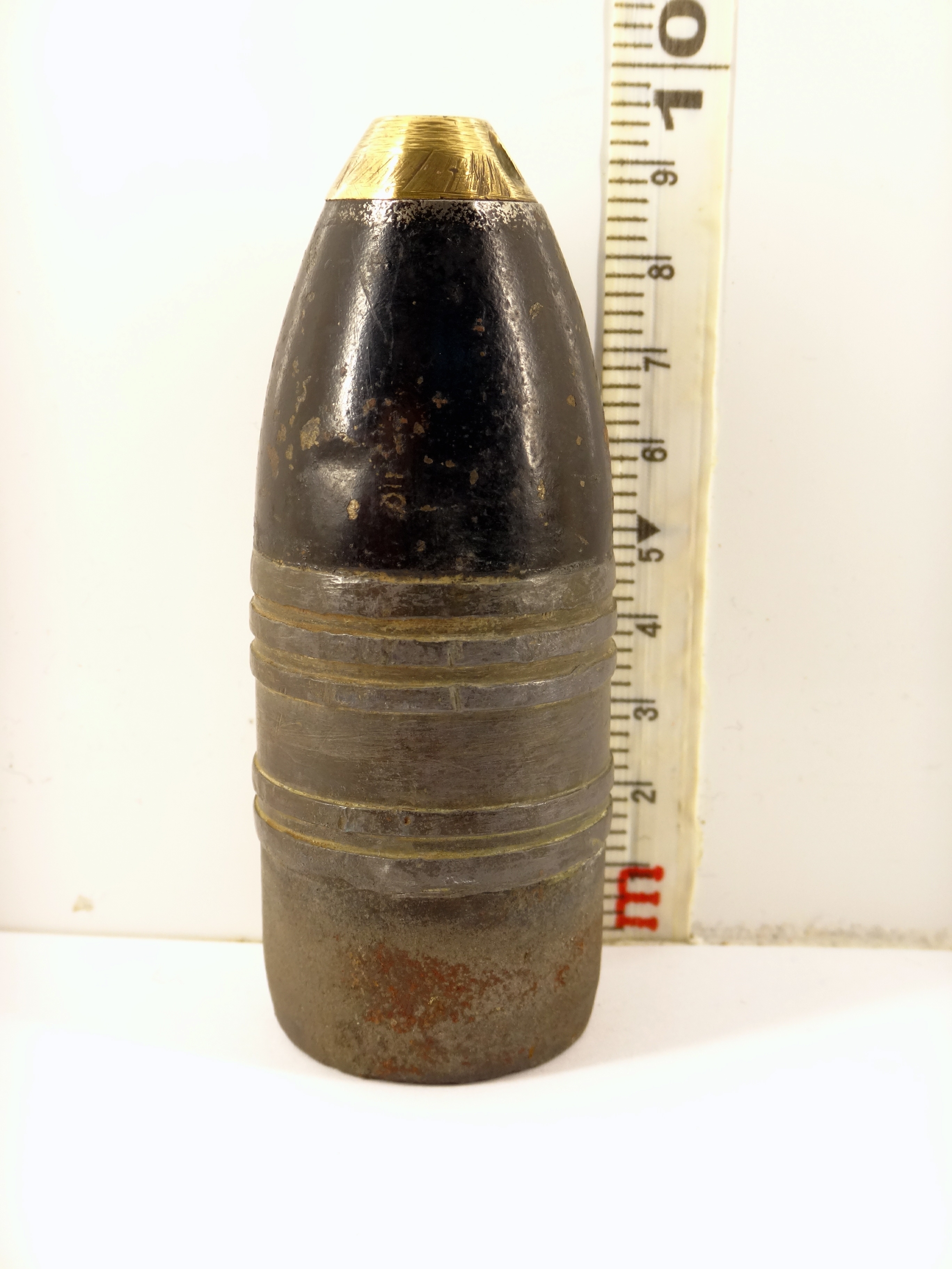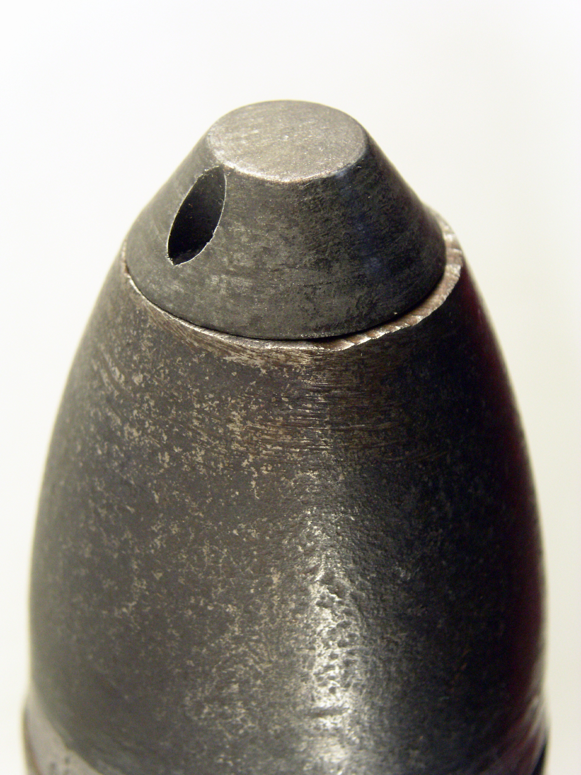 Obus explosif à large ceinture de plomb et fusée inerte / Explosive shell with a wide lead band and inert fuse